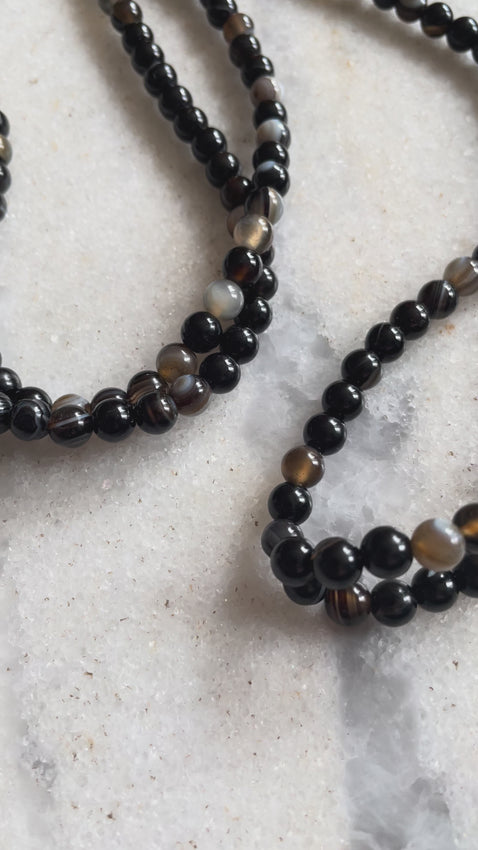 Mais de 300 contas de Ágata natural preta mesclada compõem esta peça que além de tudo, também é um amuleto cheio de energia.